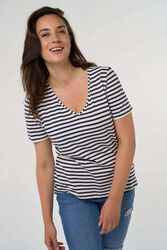Esta camiseta de rayas con un favorecedor cuello en V es un auténtico imprescindible. Con manga corta y un ligero tejido elástico de viscosa, ofrece la máxima comodidad y libertad de movimiento. El diseño de corte recto acentúa de forma bonita las curvas. Combina este top versátil con nuestros vaqueros o vaquera preferidos para un look elegante y femenino sin esfuerzo.