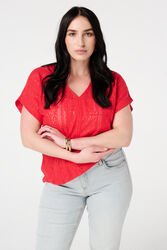 Apuesta por un look desenfadado con este top. Tiene escote en pico, manga corta y corte recto. El estampado de punto calado hace que sea muy agradable de llevar. Combínalo con nuestros capris y completa tu look.